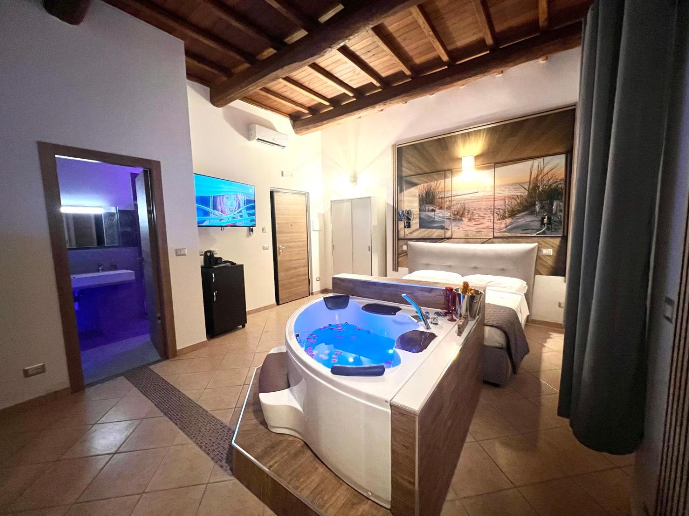 Camera Deluxe Matrimoniale con Vista Mare. This double room features a hot tub. The double room includes a private bathroom, well-fitted with a bath, a shower, a bidet and a hairdryer. The spacious air-conditioned double room provides a flat-screen TV, a private entrance, a seating area, a wardrobe as well as sea views. The unit offers 1 bed.