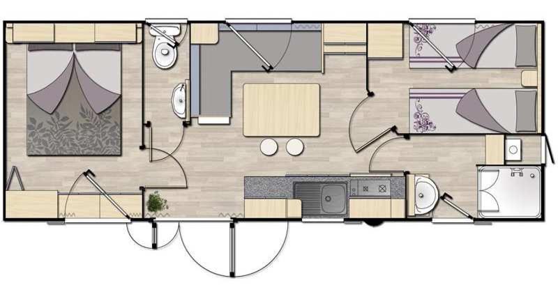 Casa Mobile Basic (4 Adulti). Casa mobile dotata di veranda e angolo cottura. La struttura non fornisce la biancheria da letto e gli asciugamani, che dovrete portare da casa. Gli utensili da cucina non sono inclusi. ;